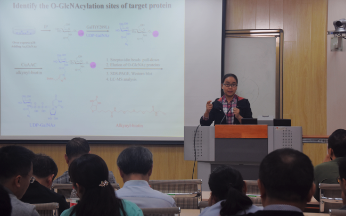 主题报告上,李霞博士简要介绍表观遗传的概念和表观遗传学主要研究内容,详细讲述了三个方面的研究工作。一是在DNA 甲基化方面的研究,揭示了DNA甲基化转移酶Dnmt3a正向调控TLR诱导的抗病毒天然免疫应答、促进巨噬细胞分泌抗病毒因子即I型干扰素的产生,从而使巨噬细胞处在一个准备状态,时刻准备着,当受到外源病毒感染的情况下,就可以快速作出反应,分泌抗病毒因子I型干扰素,发挥抗病毒的效应;对传统观点即DNA甲基化促进基因的沉默提出新挑战,发现在巨噬细胞中,表观修饰酶Dnmt3a可以正向调控一些基因的表达;发现了抗病毒信号通路中关键激酶TBK1新的翻译后修饰,即乙酰化修饰,并且明确了乙酰化修饰的位点。该研究证明了正常情况下Dnmt3a对于巨噬细胞中TBK1激酶活性的维持和Ⅰ型干扰素的产生发挥重要作用,展示了在PRRs信号通路和抗病毒天然免疫反应中,翻译后修饰与表观调控相结合的调控模式,从DNA甲基化、组蛋白修饰和激酶的翻译后修饰这3个层面入手为抗病毒感染的临床干预和治疗提供潜在的靶点。研究成果以第一作者发表于Nature Immunology 杂志。二是在组蛋白修饰方面的研究,揭示了表观遗传分子Kdm6a参与正向调控巨噬细胞天然免疫应答的经典和非经典功能,一方面可以通过其经典功能,即其组蛋白去甲基化酶活性调控IL-6的产生,另一方面亦可通过其非经典功能,即通过其相互作用蛋白间接调控IFN-β的产生;发现了Kdm6a通过调控eRNA的转录从而促进IFN-β产生的新机制。该研究重点探讨了细胞因子调控的核内机制,丰富了细胞因子的调控模式,为表观遗传分子在炎症和自身免疫性疾病中的作用开辟了新的方向。我们就可以在这种差异调控的机制中,寻找潜在的干预靶点,这就为我们选择性的干预某一种细胞因子提供了理论基础。为进一步阐明细胞因子相关的自身免疫性疾病的发病机理提供证据,为今后的临床干预和治疗提供潜在靶点。研究成果以第一作者发表于Journal of Autoimmunity杂志。并已申请国家发明专利2项。三是在蛋白质翻译后修饰方面的研究,主要聚焦于单糖修饰,即O-GlcNAcylation修饰,发现了两个经典分子p38和IRF3新的翻译后修饰,并且分子的O-GlcNAcylation修饰影响其磷酸化修饰。目前重点工作是对这些分子O-GlcNAcylation修饰位点的鉴定,但是鉴定很困难,因此李博士课题组利用代谢分子化学标签的原理,开发了一种新的检测鉴定方法。