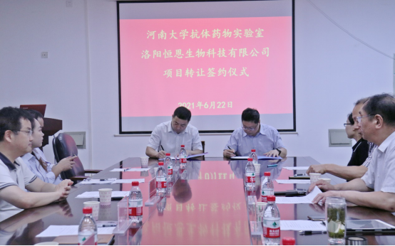 科学技术研究院李谦副经理代表学校与恒恩生物夏金光董事长签署转让协议。仪式结束后,刘雨霖书记和恒恩生物领导参观了实验室,项目主要负责人王志增博士详细介绍了目前课题组正在开展的系列研发成果,双方进行了愉快的座谈。